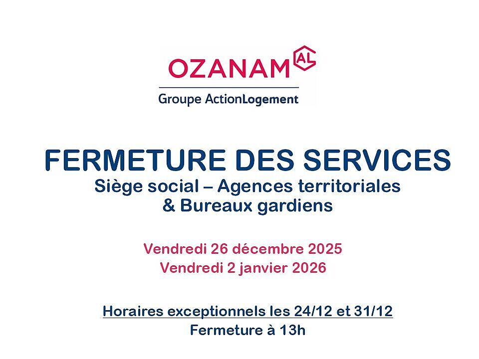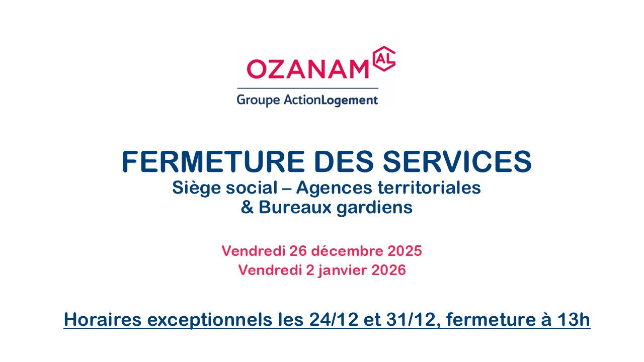 La société OZANAM vous informe de la fermeture exceptionnelle du siège social, des agences territoriales et des bureaux gardiens les vendredi 26 décembre 2025 et vendredi 02 janvier 2026.