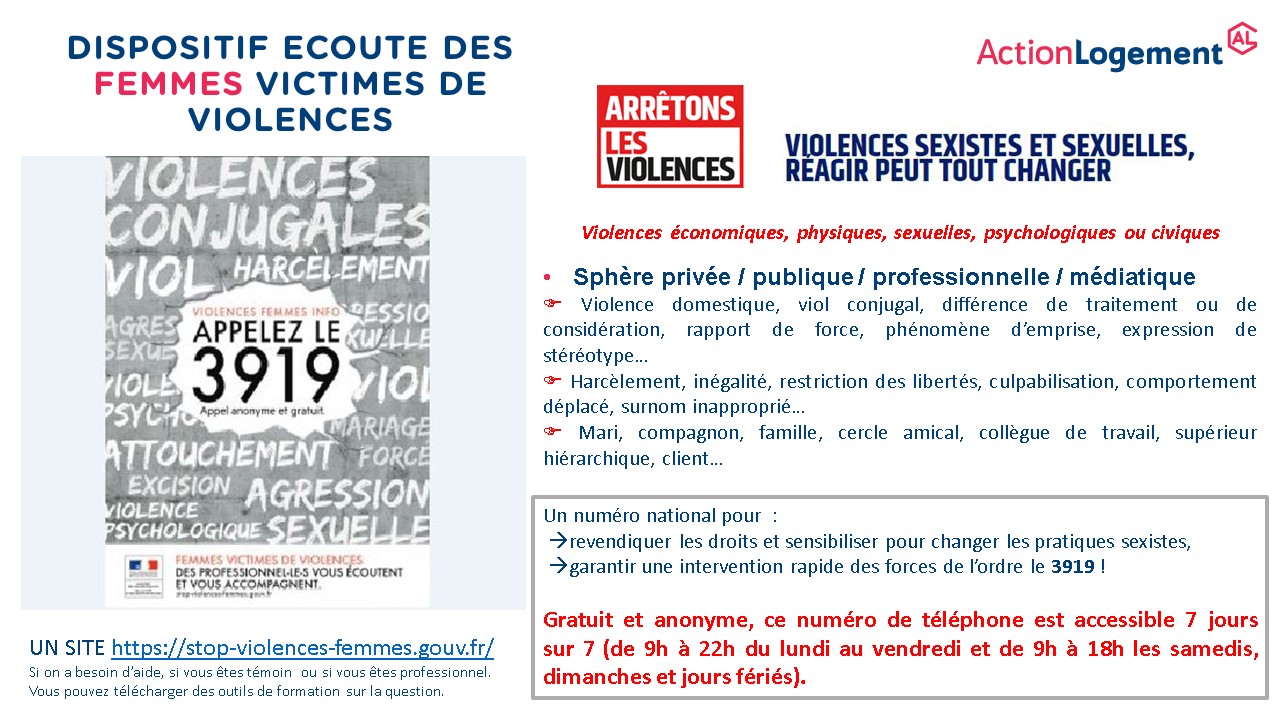 En cette période de confinement, la société OZANAM Groupe Action Logement rappelle le numéro de téléphone pour les femmes victimes de violence : 39 19.